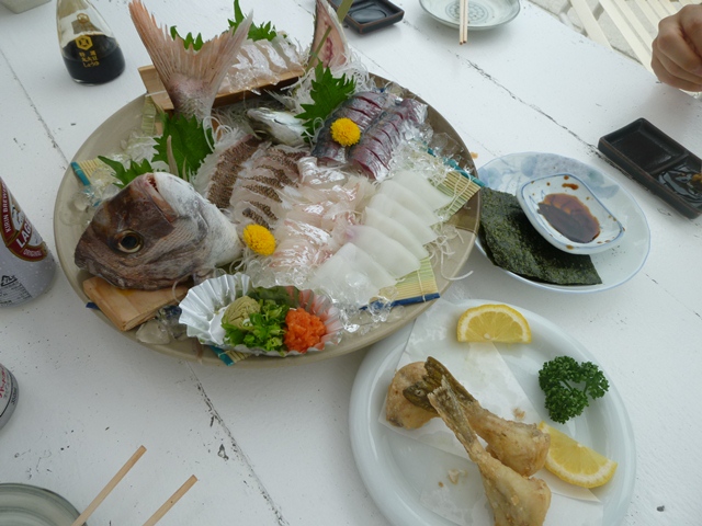 活け作りとフグのから揚げ。鯵の塩焼き。