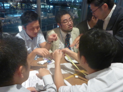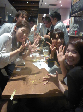 パスタを使って、1つのマシュマロを一番高い位置に置く事ができたチームの勝利。