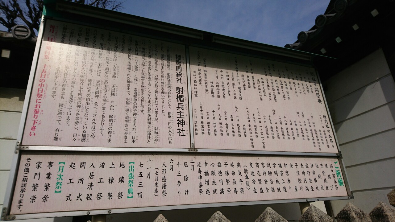 総社というのはその名の通り総合的な社なんですね。播磨の国の総合的な社ですから播磨国総社なんですね。神様のデパート姫路支店ですね。技のデパートモンゴル支店旭鷲山みたいですね。別名「射楯兵主神社」(いたてひょうずじんじゃ)と言いいます。