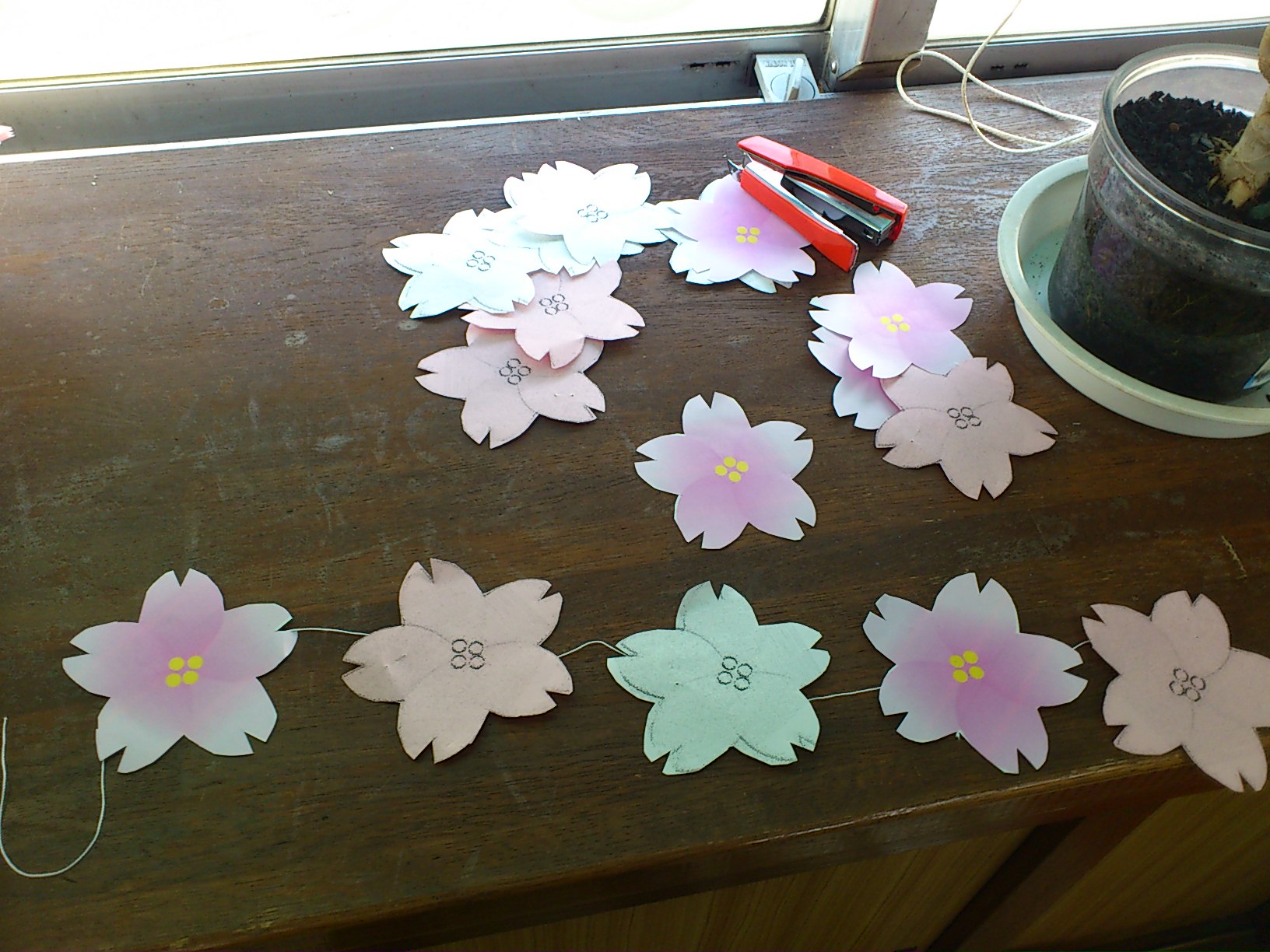 みんなが夜なべして作った桜を凧糸に張り付ける。