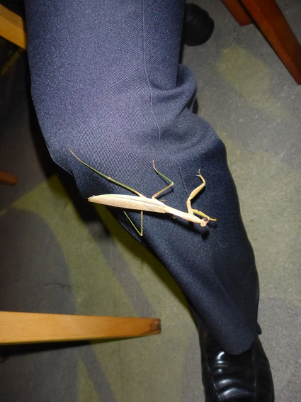 カトゥ委員長の足にカマキリが訪問!流石、虫からも好かれる指導者同志よ!!会員拡大やね。