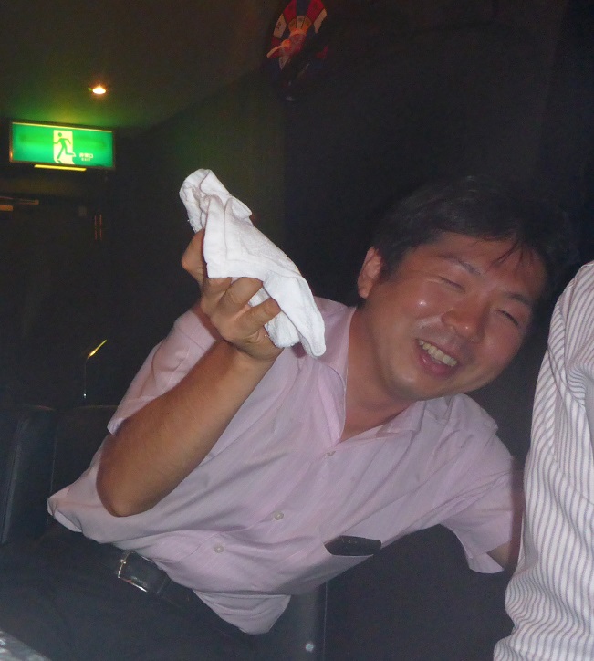 左の人(ウツミ氏)が首に巻いているサムライブルーのタオルも今回のビアナイト参加賞であります。