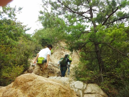 厳しい岩場の登りが続きます。
