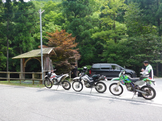 私は同じくヤマハ・WR250というボチボチなオフロードマシン、もう一人はライムグリーンのKLX250。