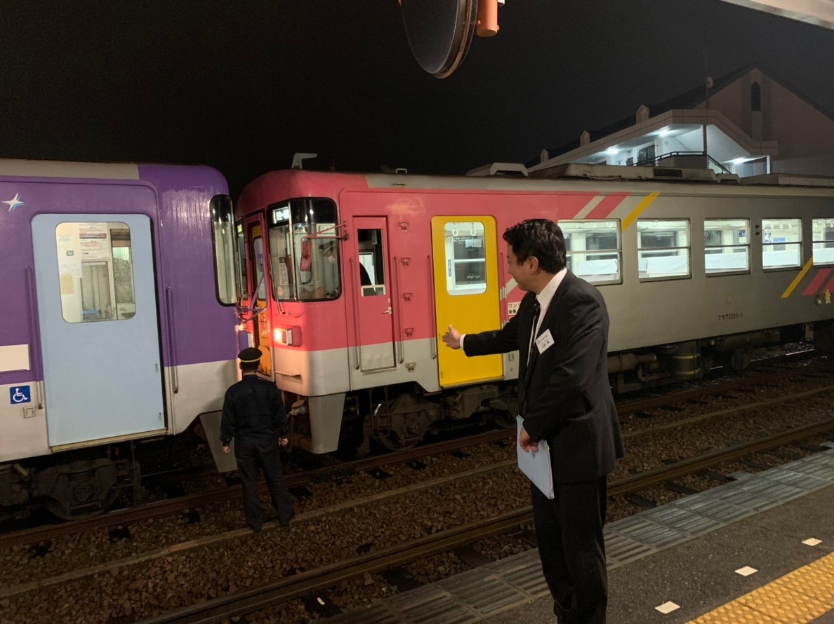 18:35に集合、神姫バスにて、北条鉄道の北条町駅へ、そこから貸切列車の発車です。